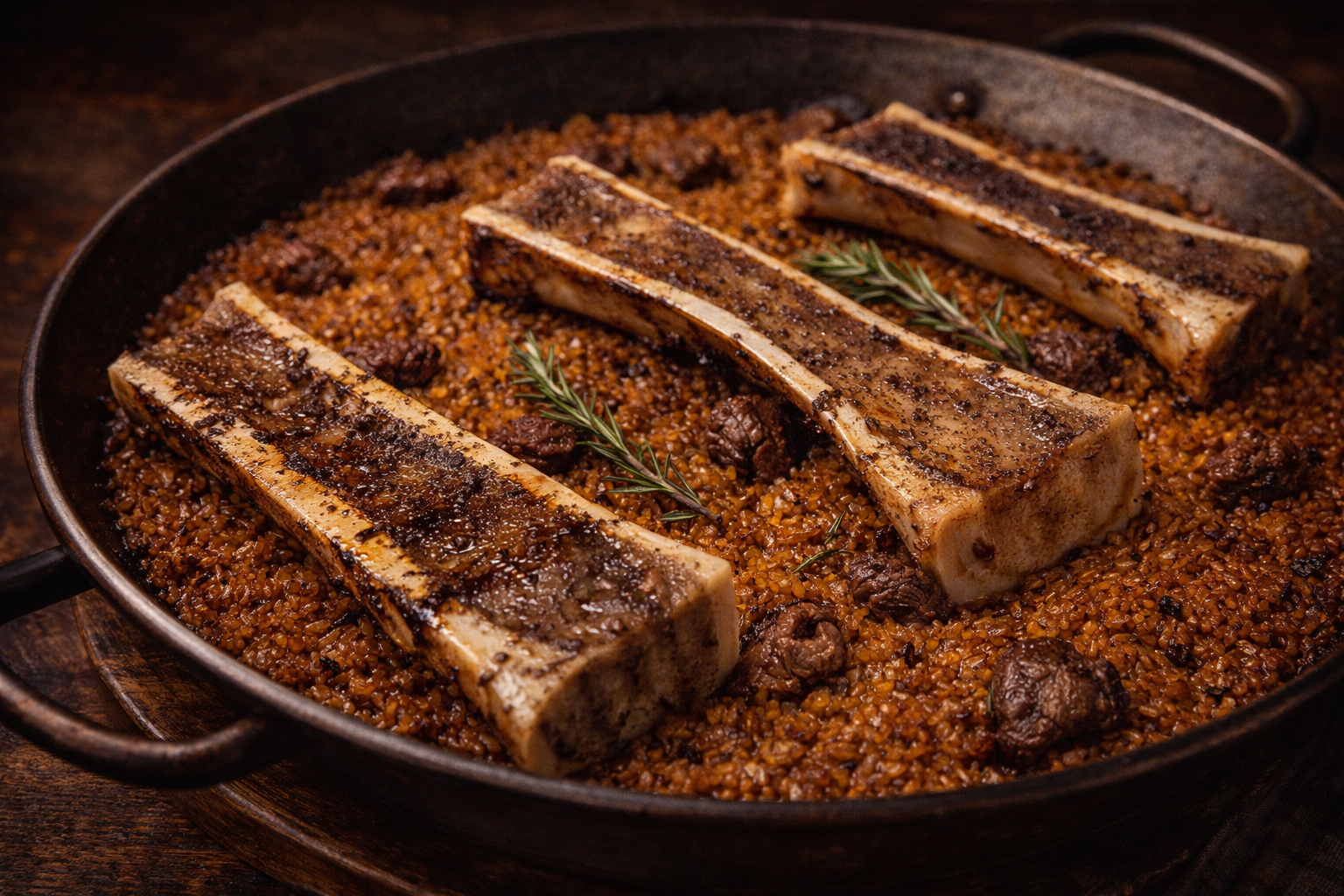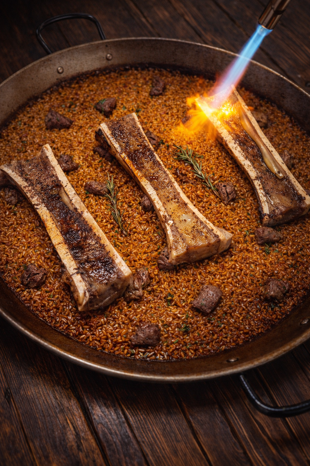 El tuétano se termina directamente en el hueso con un ligero toque de calor, potenciando su textura y sabor antes de integrarlo en el arroz junto a nuestro sofrito casero.